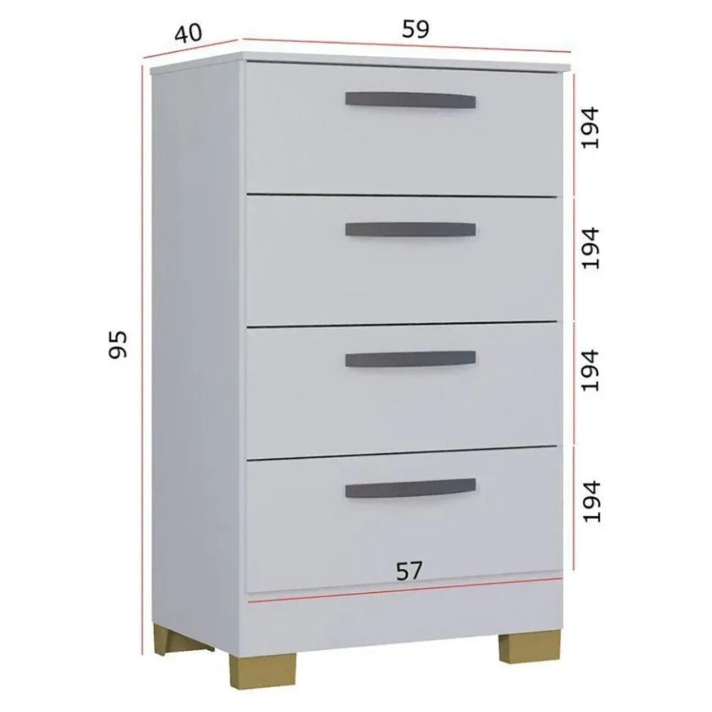 Possui quatro gavetas amplas, ideais para armazenar roupas, acessórios e objetos pessoais, mantendo tudo sempre bem organizado. As corrediças metálicas garantem um deslizamento suave e maior durabilidade no uso diário.