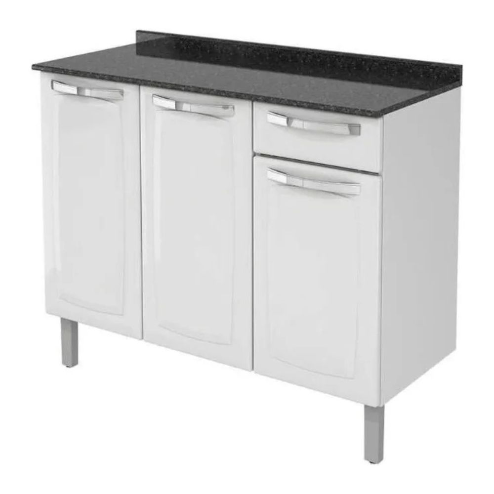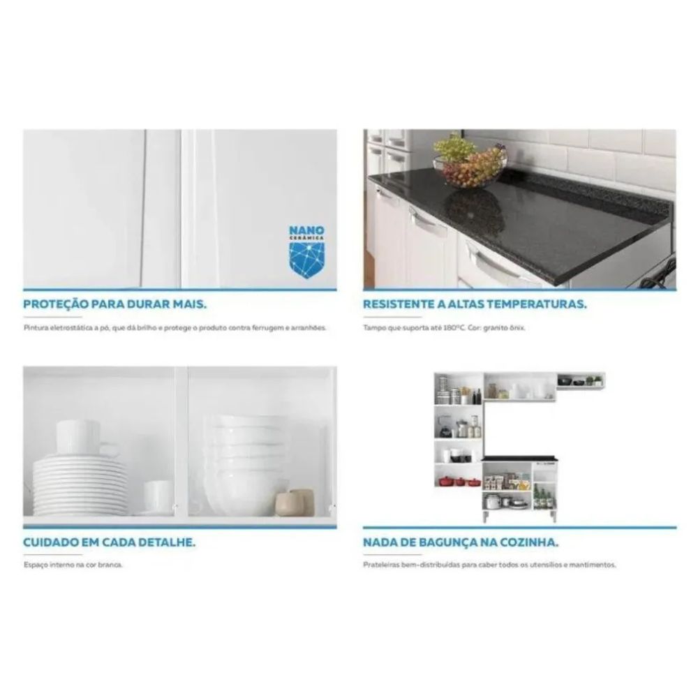 O tampo do balcão é resistente a manchas e altas temperaturas, suportando até 180°C, o que proporciona mais praticidade no uso diário. Além disso, os pés reguláveis permitem melhor ajuste ao piso, garantindo estabilidade e alinhamento do conjunto.