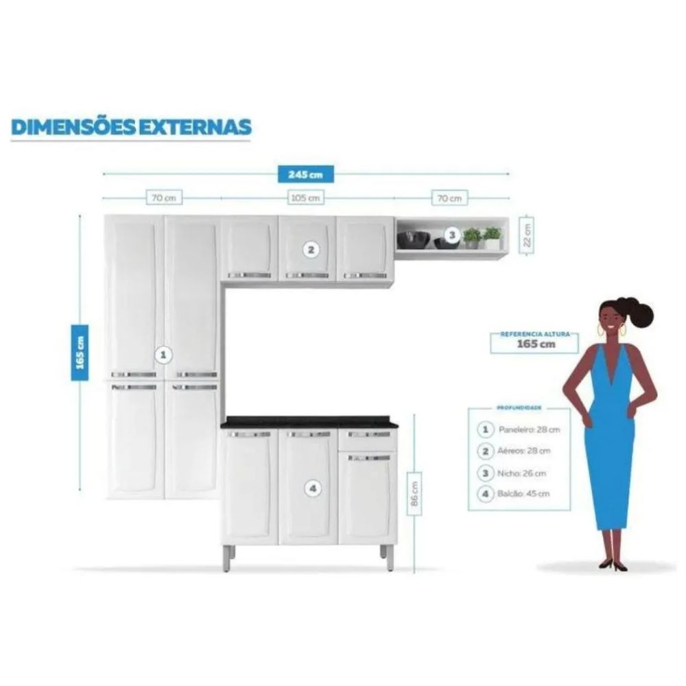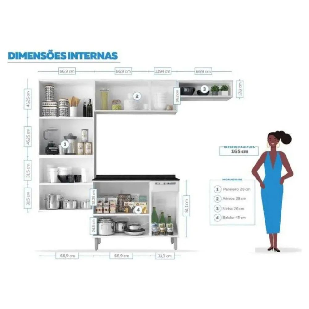 A cozinha é composta por paneleiro duplo, armário aéreo, balcão com tampo e nicho decorativo, oferecendo ótimo espaço interno com prateleiras bem distribuídas para acomodar utensílios, mantimentos e eletrodomésticos.