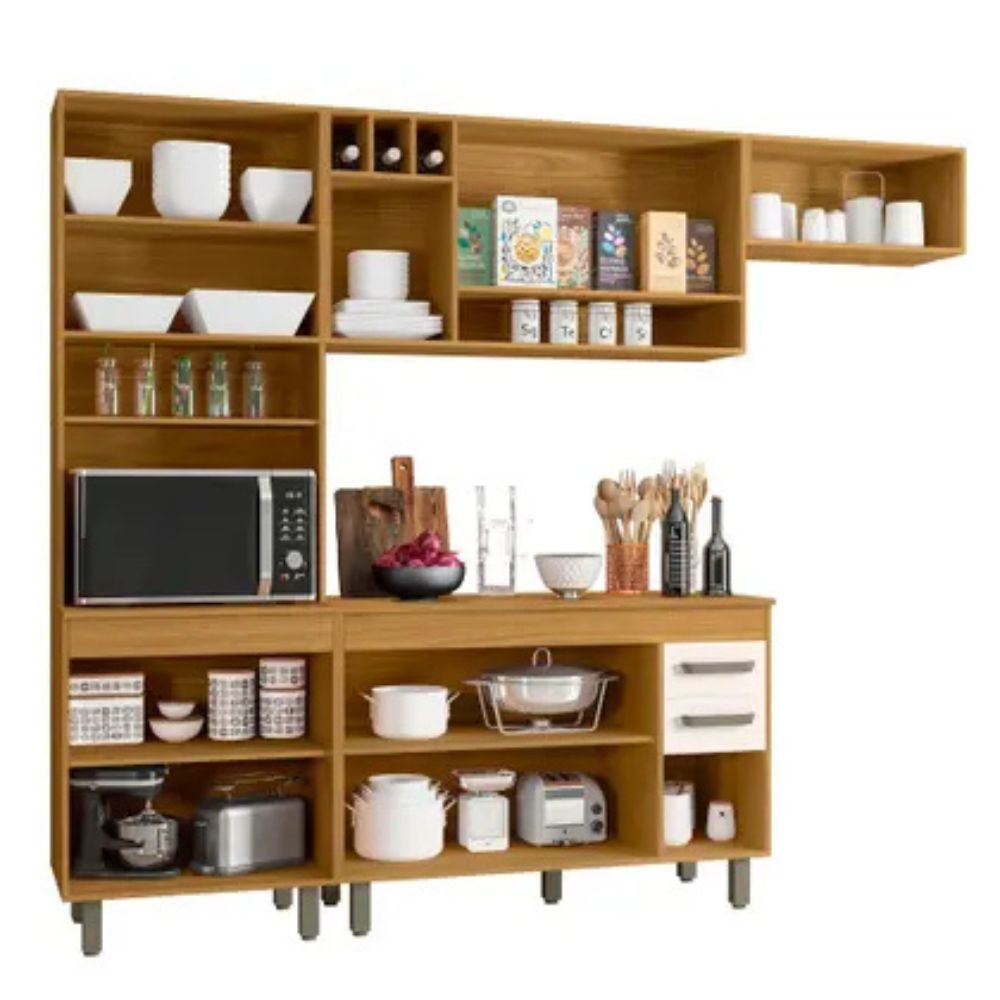 O paneleiro possui amplo espaço interno com prateleiras e nicho para micro-ondas ou forno, enquanto o aéreo conta com nicho decorativo e adega para até 3 garrafas. Já o aéreo para geladeira possui porta basculante com pistão a gás, proporcionando abertura suave e prática.