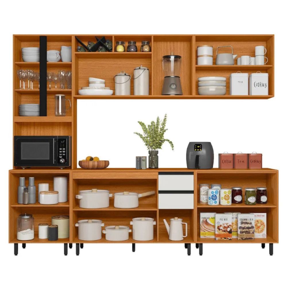 Cozinha Modulada Poliman Ravena une design modernoalta funcionalidade e excelente aproveitamento de espaço, com 5 peças13 portas2 gavetas e acabamento sofisticado em Freijó Ripado e Off White acetinado.