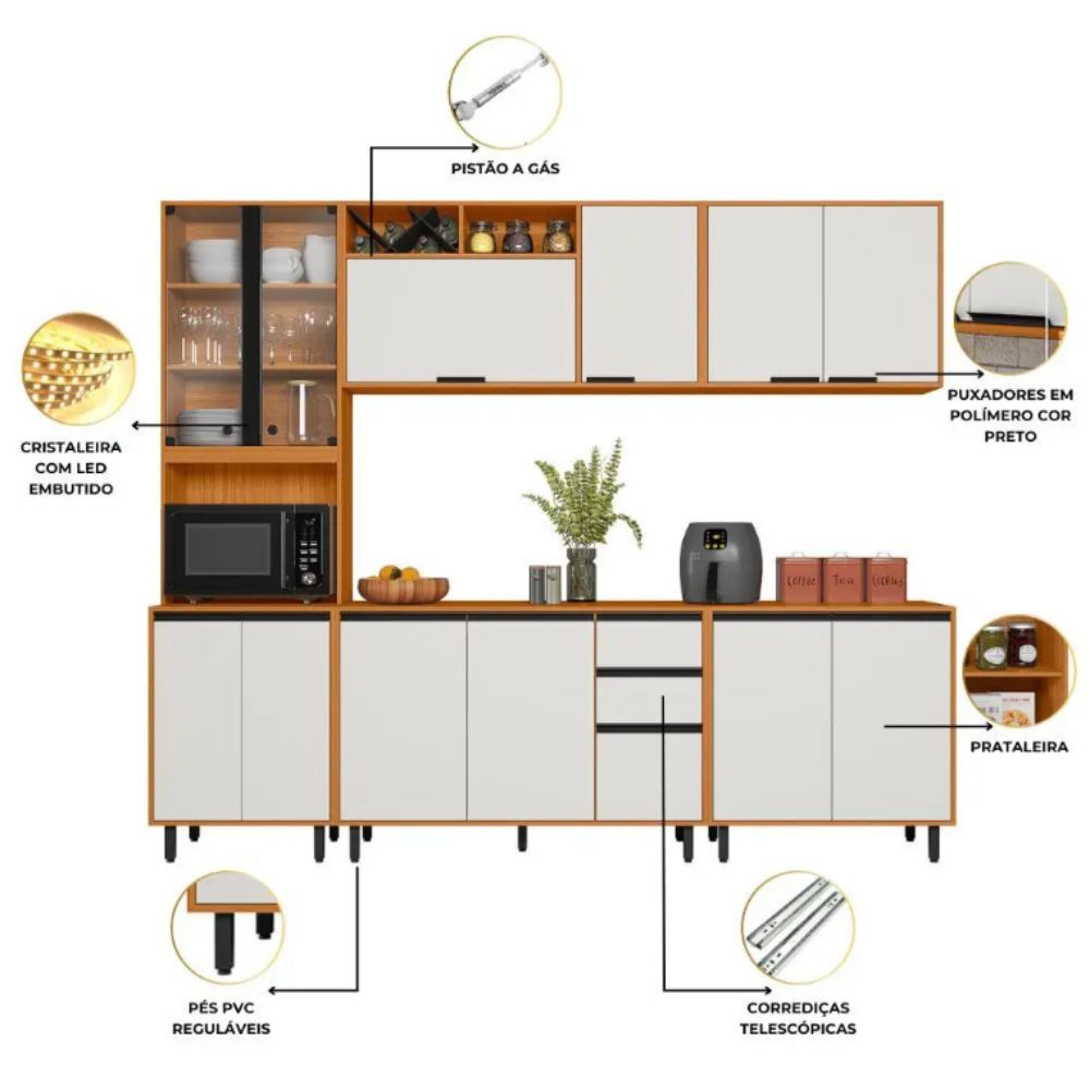 O balcão de 120 cm acompanha tampo de 15 mm de espessura, que pode ser removido para instalação de pia no padrão 120 x 50 cm. Também permite recorte conforme manual para instalação de cooktop. O armário aéreo de 120 cm possui pistão a gás e nicho garrafeiro, enquanto o aéreo de 80 cm conta com prateleira interna. Já o balcão de 80 cm possui prateleira móvel, facilitando a organização de utensílios e objetos maiores.