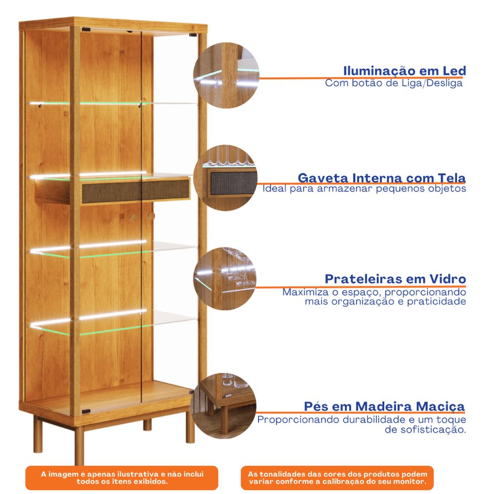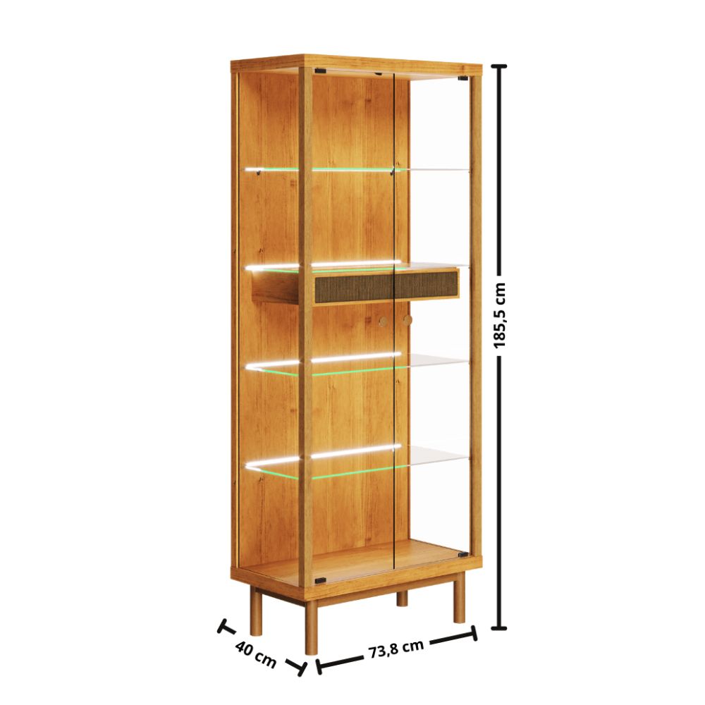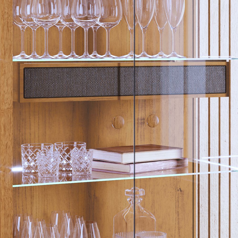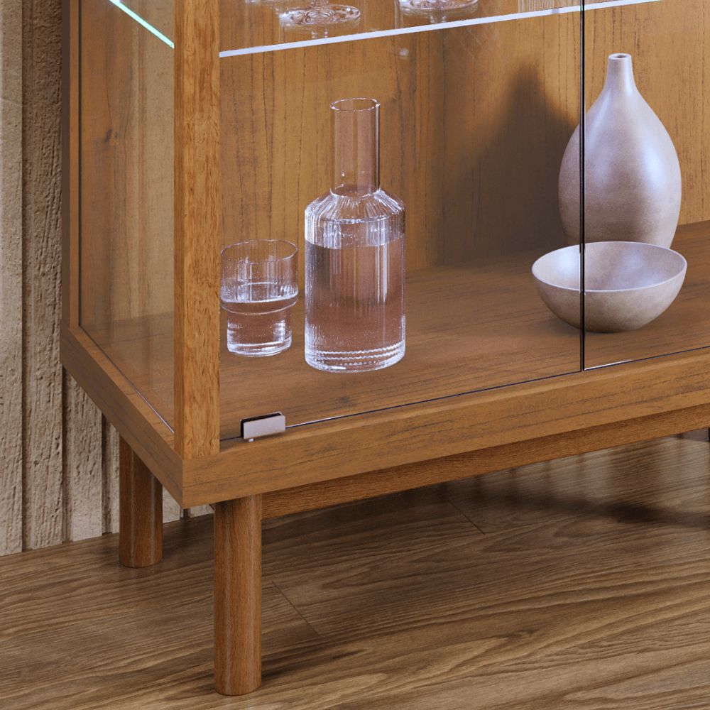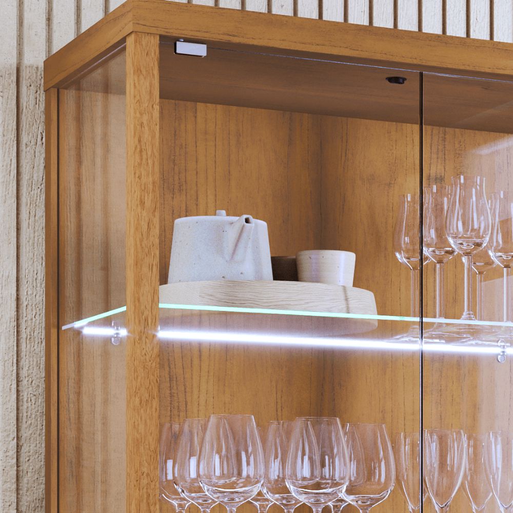 Seu design se destaca pelas portas e laterais em vidro, que permitem ampla visualização dos itens expostos, além das prateleiras em vidro temperado que garantem leveza e modernidade ao conjunto. A iluminação em LED aplicada na parte traseira das prateleiras cria um efeito acolhedor, valorizando louças, cristais e objetos decorativos.