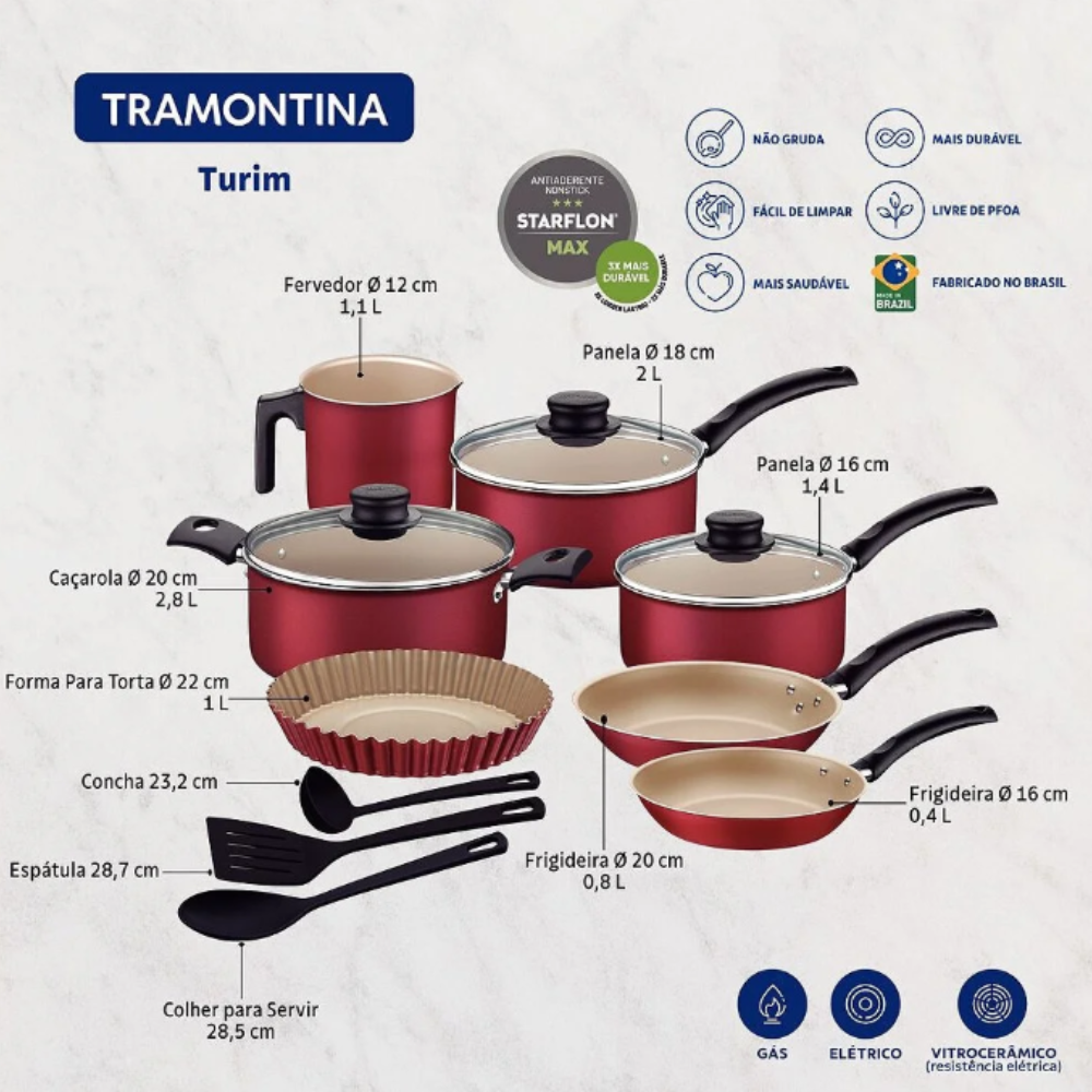 O Kit de Cozinha Tramontina Turim é a escolha perfeita para quem busca praticidade, durabilidade e eficiência na cozinha. Produzido em alumínio com revestimento interno e externo antiaderente Starflon Max, garante um cozimento uniforme dos alimentos, evita que grudem e facilita a limpeza.