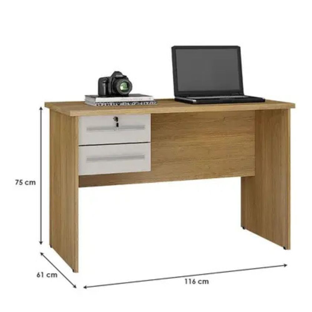 O móvel possui duas gavetas equipadas com corrediças telescópicas, garantindo abertura suave e maior praticidade na organização de documentos, acessórios e objetos pessoais. Uma das gavetas conta com fechadura, oferecendo mais segurança para itens importantes.